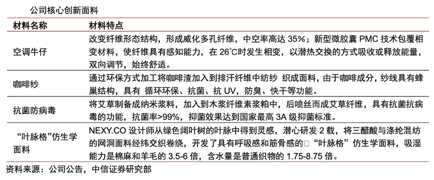 經典案例:根據公司公告、中信證券研究部等綜合資訊表明,贏家時尚公司從功能及環保角度對面料進行創新升級,核心創新面料包括:空調牛仔、咖啡紗、抗菌防病毒、葉脈格仿生學面料。其中葉脈格仿生學面料為公司與面料商合作開發,將三醋酸與滌綸混紡的網洞面料經緯交織卷繞,大幅提升吸濕力和含水量,為公司獨家使用。