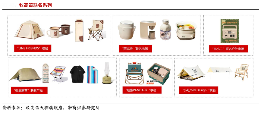 經(jīng)典案例:根據(jù)牧高笛天貓旗艦店、浙商證券研究所等綜合資訊表明,中國露營市場正 從“專業(yè)性能”向“時(shí)尚精致”轉(zhuǎn)變,牧高笛公司于 2021 年推出 Line Friends 聯(lián)名系列,打破傳統(tǒng)帳篷單調(diào)沉悶的形象,瞄準(zhǔn)親子、女性、年輕人客群,該聯(lián)名系列同時(shí)還包括天幕、拖 車、睡袋、折疊椅、野餐墊等配套產(chǎn)品,目前已占大牧銷售額約10%。