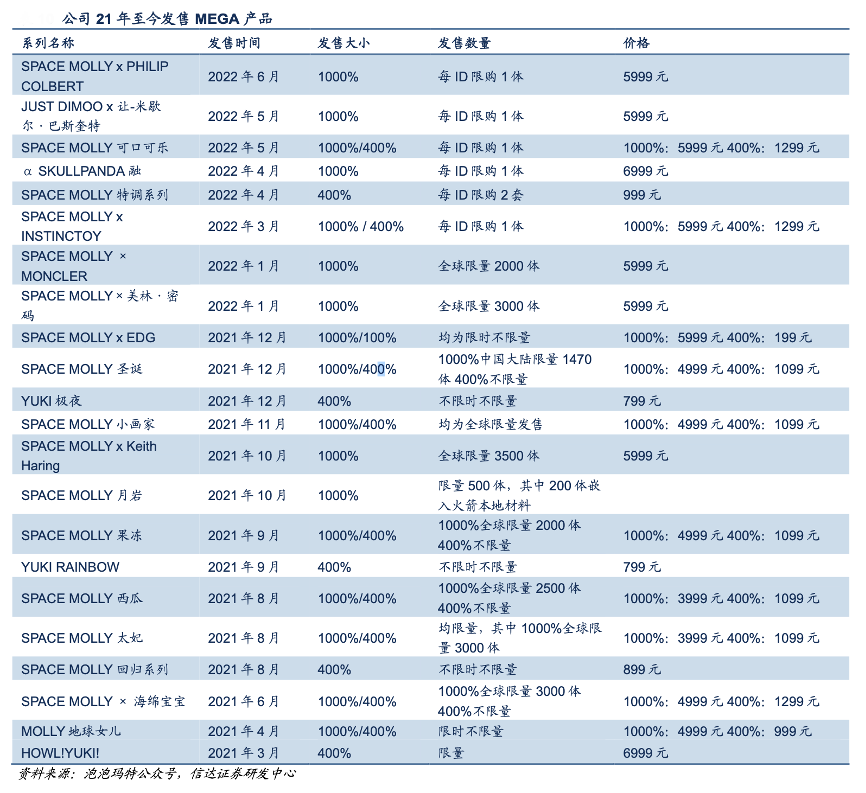經典案例:根據泡泡瑪特公眾號、信達證券研發中心等綜合資訊表明,泡泡瑪特2021年正式推出高端潮玩產品線“MEGA 珍藏系列”,定位“年輕人的第一件收藏品”,一經推出便迅速引爆市場。除了海綿寶寶聯名款以外,2021年還發售了 9 款 100%SPACE MOLLY 珍藏系列產品,共吸引超過 870 萬人次參與抽簽,公司產品日益實現從入門級潮玩盲盒到高端收藏潮玩產品全覆蓋。
