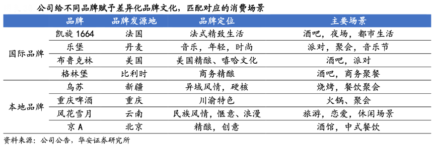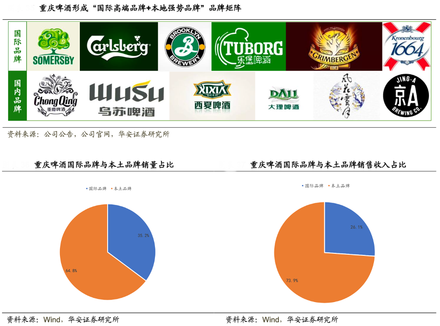 經(jīng)典案例:根據(jù)公司公告、wind、公司官網(wǎng)、華安證券研究所等綜合資訊表明,目前重慶啤酒公司形成了國際高端品牌+本地強勢品牌的豐富品牌組合,其中國際高端品牌有凱旋 1664、嘉士伯、樂堡、格林堡、布魯克林及夏日紛等;本地強勢品牌包括烏蘇、重慶、大理、風(fēng)花 雪月、西夏、天目湖、京 A 等。據(jù)公司 2021 年年報,本土品牌實現(xiàn)銷量 201.5 萬千升,銷量占比 73.9%,貢獻(xiàn)64.8%營業(yè)收入。