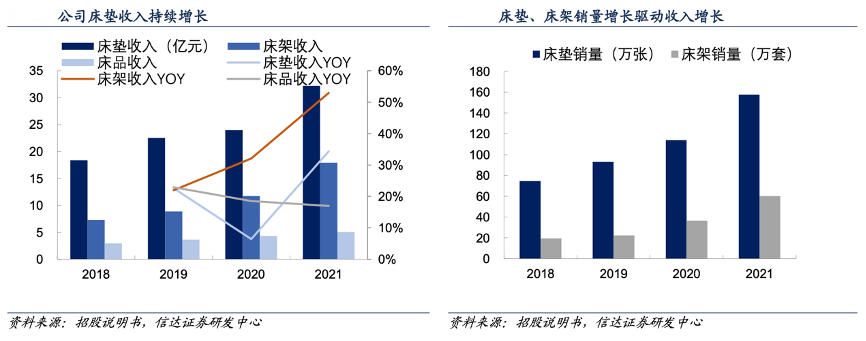 經典案例:根據招股說明書、信達證券研發中心等綜合資訊表明,床墊公司自 2018 年以來床墊銷售收入 逐年持續增長。床架作為床墊產品的載體,是健康睡眠系統的主要組成部分。一方面,公司床墊產品的銷售增長會拉動床架產品的銷售增長;另一方面,床架產品的銷售增長也會促進床墊產品的銷售增長。