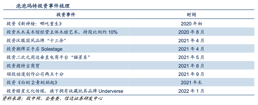 經(jīng)典案例:根據(jù)投中網(wǎng)、企查查、信達證券研發(fā)中心等綜合資訊表明,泡泡瑪特公司對動漫、國風(fēng)潮牌、潮玩品牌等領(lǐng)域投資,在參投兩部優(yōu)秀國內(nèi)動漫電影《新神榜:哪吒重生》、《白蛇 2: 青蛇劫起》后,公司推出了相應(yīng)IP 的潮玩盲盒。21 年 4 月、22 年 1 月,公司分別投資潮 牌買手店 Solestage、暗星文化傳媒(旗下?lián)碛惺詹赝婢咂放?nbsp;Underverse),產(chǎn)生業(yè)務(wù)戰(zhàn)略聯(lián)動。