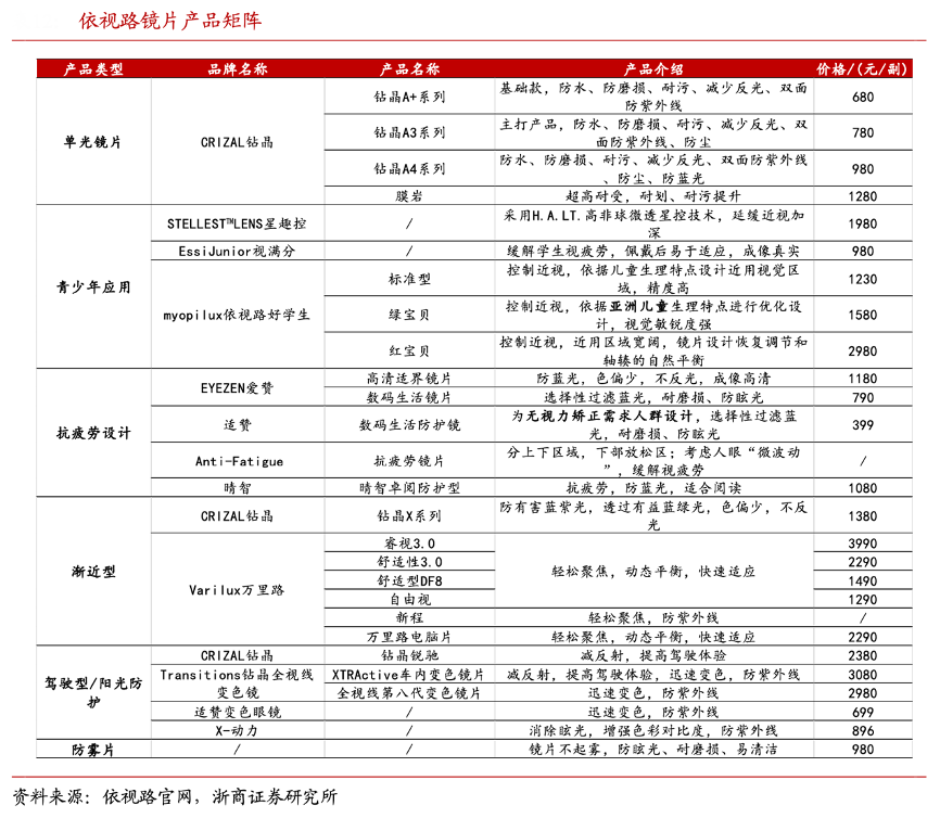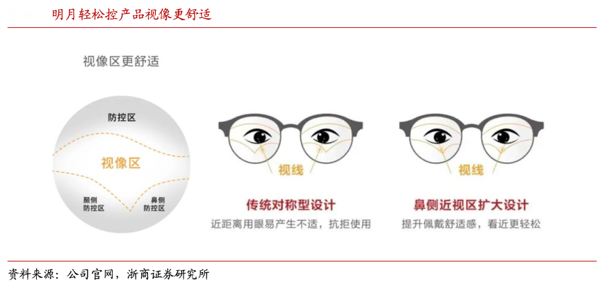 經典案例:根據公司官網、浙商證券研究所等綜合資訊表明,2021 年 7 月,明月鏡片公司聯合中國工程院莊松林院士團隊共同推出采用周邊離焦技術的青少年近視防控鏡片“輕松控”,價格定位1598-2598元,2021年底,公司進一步推出采用多點離焦技術的近視防控鏡片“輕松控Pro”,顯現出公司的研發和產品技術迭代能力,價格帶亦有上移(2298-2998元)。