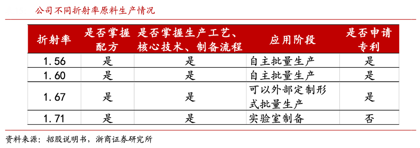 經典案例:根據招股說明書、浙商證券研究所等綜合資訊表明,預聚物的生產及后續的聚合固化工藝是鏡片生產過程中最關鍵的環節,依視路公司目前已實現了 1.56、1.60 折射率的預聚物的規模化自產和 1.67、1.71 折射率預聚物的生產工藝儲備,公司自產原料品質優良,在實現自給的同時也對業內其他鏡片廠商進行銷售。