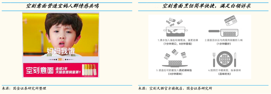 經典案例:根據空刻天貓官方旗艦店、國金證券研究所等綜合資訊表明,面對精致寶媽,空刻抓住“愛 孩子”、“注重產品健康安全”等特點,以電媒“媽媽我餓”等廣告詞,營造寶媽情感共鳴。面對資深中產,這類消費人群往往注重品質和健康生活,空刻以富含橄欖 油、海鹽等進口食材為賣點,打出與意大利米其林三星大廚合作研發的王牌,加深空刻與正宗意大利面的綁定。