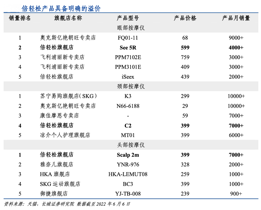 經(jīng)典案例:根據(jù)天貓、長城證券研究院等綜合資訊表明,與同類目其他產(chǎn)品相比,倍輕松公司產(chǎn)品定價更高,產(chǎn)品價格普遍處于行業(yè)前列。以頸部按摩儀為例,銷量前五名的價格普遍在 500 元以下,而市場中產(chǎn)品的平均價位也在 200-300 元之間。公司旗下產(chǎn)品普遍定價較高,并且也能獲得領(lǐng)先的銷量,可見產(chǎn)品溢價明確,這樣可以保障公司享有較高的利潤空間。