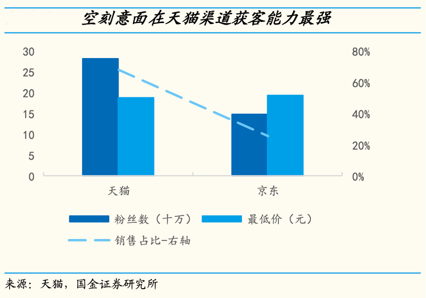 經典案例:根據天貓、國金證券研究所等綜合資訊表明,意面處于發展初期,各品牌仍在摸索競爭策略,目前以互聯網營銷為主,面向C端售賣。空刻意面提出的輕烹意面既能滿足C端消費者對餐廳品質的追求,又能解決西式調料昂貴的痛點。大單品黑椒牛柳、番茄肉醬均表現較好。