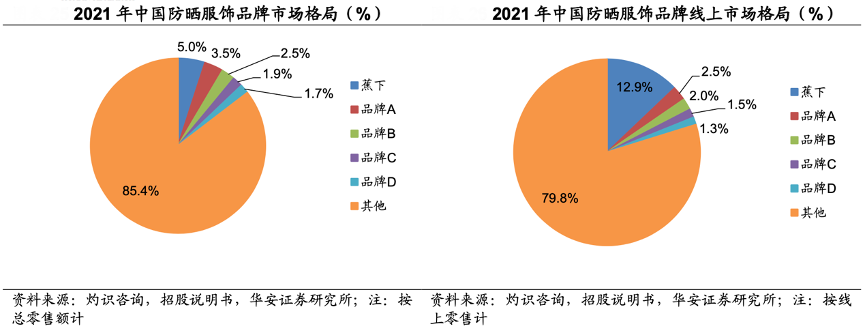 經(jīng)典案例:根據(jù)灼識(shí)咨詢、招股說(shuō)明書、華安證券研究所等綜合資訊表明,結(jié)合灼識(shí)咨詢估計(jì),2021年中國(guó)防曬服飾品牌總零售額 CR5 為14.6%,其中蕉下市場(chǎng)份額為5.0%;線上零售額 CR5 為 20.2%,其中蕉下市場(chǎng)份額為12.9%。以2021年總零售額及線上零售額計(jì),公司分別擁有 5.0%和 12.9%的市場(chǎng)份額,已成為中國(guó)第一大防曬服飾品牌。
