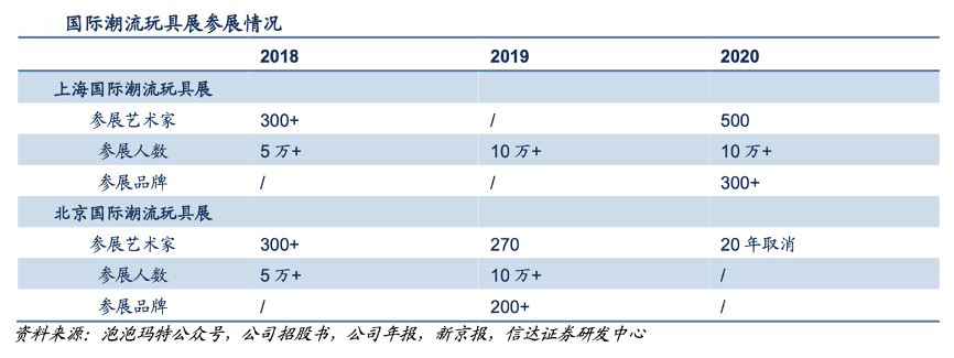 經典案例:根據泡泡瑪特公眾號、公司招股書、公司年報、新京報、信達證券研發中心等綜合資訊表明,泡泡瑪特公司每年于北京、上海定期舉辦兩次國際潮流玩具展 (PTS),邀請數百名藝術家帶來數百款作品與粉絲見面,按參觀人 次計,北京國際潮玩展和上海國際潮玩展已成為中國最大的潮流玩具展,有助于公司吸引更多優質人才。2020年上海國際潮流玩具展吸引了 500 名藝術家參展,參展品牌突破 300 個, 參展人次超過 10 萬。