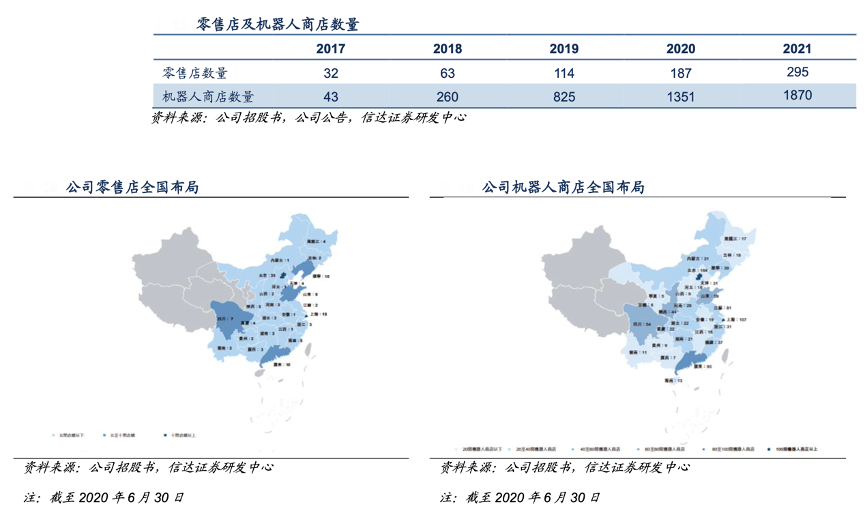 經典案例:根據公司招股書、信達證券研發中心等綜合資訊表明,泡泡瑪特線下渠道已基本完成全國覆蓋。截至2021年末,公司擁有295家零售店與1870家機器人商店。截至2020年6月末,公司零售終端已基本完成全國布局,僅個別省份尚未覆蓋,其中零售店北京、上海、廣東門店數較多,分別為 35/18/10 家門店,機器人商店北京、上海、廣東門店數排名前三,分別為 164/107/93 家。