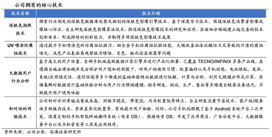 經典案例:根據公司公告、國海證券研究所等綜合資訊表明,近年來,傳音公司加速研發布局,通過識別技術的創新變革點,構筑“用戶和技術雙驅動”的產品體系與能力;深耕本地化創新,不斷強化自身在深膚色影像技術平臺、新材料創新應用等本地化創新領域的優勢地位,并持續加大在人工智能、大數據算法、智能認知 AI 語音、AIoT垂直應用技術架構、5G等技術科研項目的投入,推進基礎研究、技術研發和產品開發三級研發體系升級。