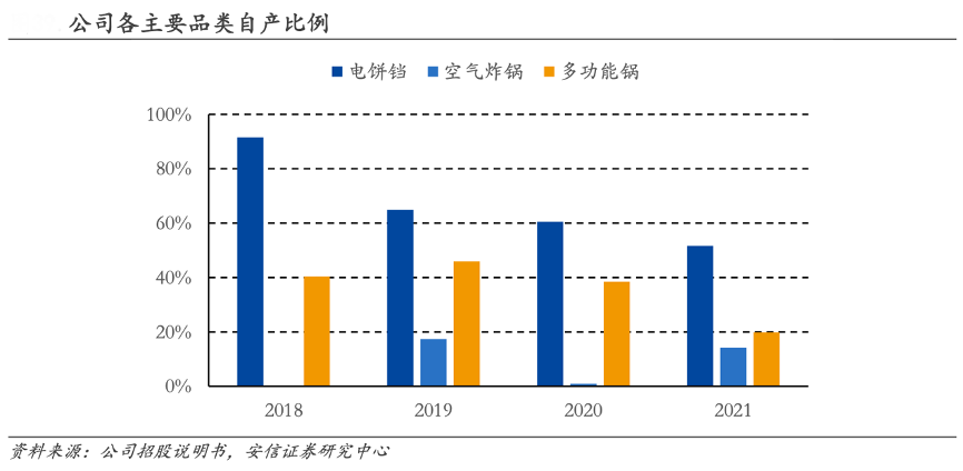 經典案例:根據公司招股說明書、安信證券研究中心等綜合資訊表明,利仁的電餅鐺自產比例逐漸下降。公司核心產品是電餅鐺,該類產品自產比例由 2018 年的 91.6%降低至 2021年的 51.6%,主要原因是自產成本長期高于外采成本。利仁于 2019 年底推出了“綠洲”系列中高端產品,其中大部分為代工產品。因此 2020 年電餅鐺單位采購成本有 所提升,但仍低于自產單位成本。2021 年公司電餅鐺自產成本仍較外采成本高 29.6%。