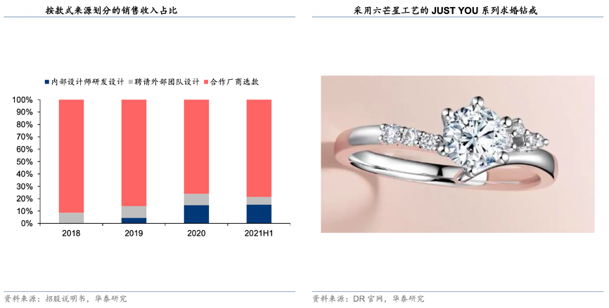 經(jīng)典案例:根據(jù)招股說明書、DR官網(wǎng)、華泰研究等綜合資訊表明,迪阿設(shè)計(jì)投入增加,并以獨(dú)家切割工藝提升產(chǎn)品力,例如暢銷款 JUST YOU 系列求婚鉆戒采用的“六芒星”切割工藝,可將鉆石切割出 99 面、使鉆石內(nèi)部呈現(xiàn)出獨(dú)特的六芒星圖案,凸顯產(chǎn)品美感。