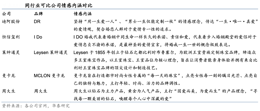 經(jīng)典案例:根據(jù)各公司官網(wǎng)、華泰研究等綜合資訊表明,首次購買場景下,迪阿為保證品牌傳遞的“唯一”內(nèi)涵,男士購買鉆戒系列產(chǎn)品時需綁定身份信息,并且只能贈予一人,通過真愛編碼等規(guī)則的限制,顧客不能再次購買產(chǎn)品贈予另一人。復(fù)購場景下,求婚鉆戒不支持重復(fù)購買,僅可通過升級換款等方式對購買產(chǎn)品進(jìn)行更新。