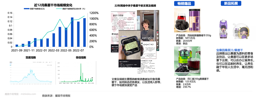 經典案例:根據魔鏡市場情報等綜合資訊表明,桑葚干市場在近一年快速走熱,該市場由克啦啦品牌引領,該品牌銷售主要依托天貓超市渠道,該渠道擁有先天流量優勢;而純果蔬汁類目近一年同比增長24%,其中桑葚汁同比增長224%,桑葚成分帶動了市場的高增長。
