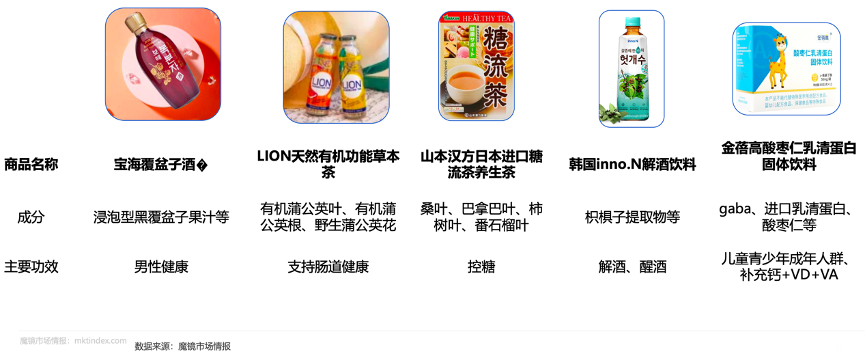 經典案例:根據魔鏡市場情報等綜合資訊表明,國內護肝、養肝市場雖處于高增長狀態,但保健食品進入門檻較高,護肝茶同質化嚴重;而韓國利用藥食同源原料姜黃、蜂蜜、枳椇子等開發出解酒產品,品牌可從“解酒”概念切入市場。