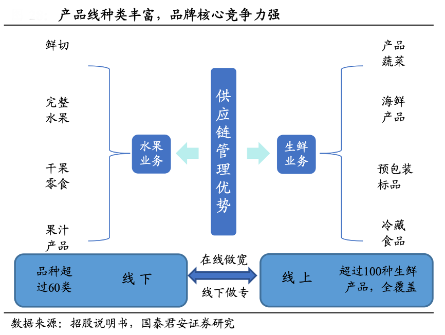 經典案例:根據招股說明書、公司官網、國泰君安證券研究等綜合資訊表明,百果園考慮到蔬菜與水果特性相近,供應鏈管理及運營的相似性及重合度;通過復制在水果領域的成功經驗,百果園憑借產業優勢及在上游種植的豐富經驗,不斷完善、整合蔬果類供應鏈體系,建立各大生鮮產品品類的生產、銷售與品控標準,持續拓展了大生鮮業務。