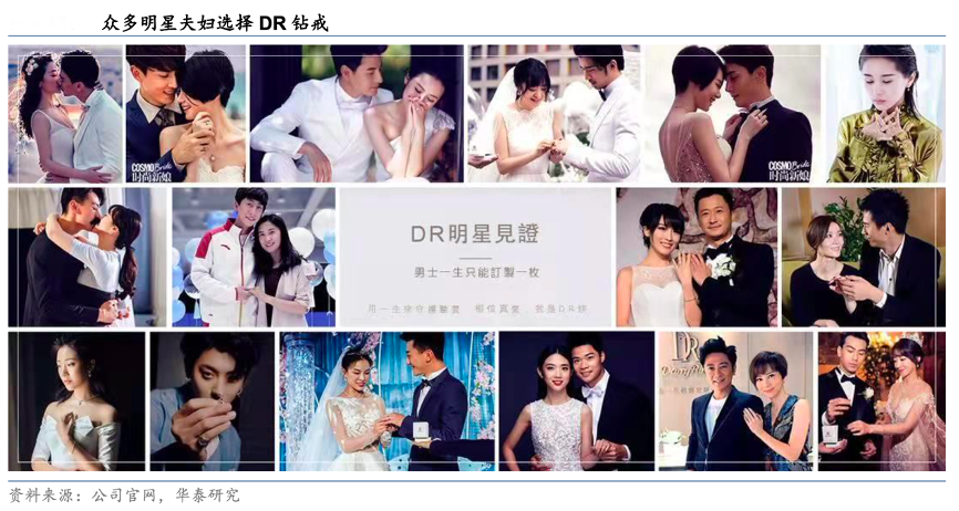經(jīng)典案例:根據(jù)公司官網(wǎng)、華泰研究等綜合資訊表明,DR邀請(qǐng)了多對(duì)演藝界、體育界明星夫婦選擇 DR 鉆戒作為愛情信物,公司借助明星夫妻恩愛甜蜜的形象,向公眾傳播唯一、真愛的品牌理念,打開品牌知名度;其還在《創(chuàng)業(yè)年代》、《不說再見》等多部熱播影視劇中植入廣告。