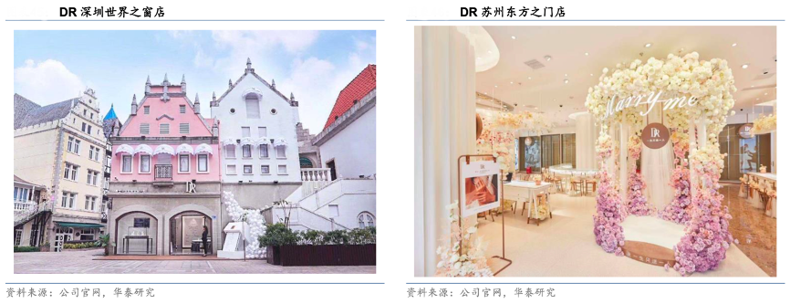 經(jīng)典案例:根據(jù)公司官網(wǎng)、華泰研究等綜合資訊表明,DR 門店分為標(biāo)準(zhǔn)店及真愛體驗(yàn)店兩種,其在多家核心城市開設(shè)真愛體驗(yàn) 店,店面面積在 200 m²以上。真愛體驗(yàn)店結(jié)合各地特色文化,采用兼具 DR 品牌調(diào)性及當(dāng)?shù)靥厣牡赇侊L(fēng)格設(shè)計(jì),為消費(fèi)者營造了溫馨浪漫的購物氛圍;并且設(shè)置表白專用區(qū)域、 提供求婚場(chǎng)地,為顧客創(chuàng)造難忘的購物體驗(yàn)。