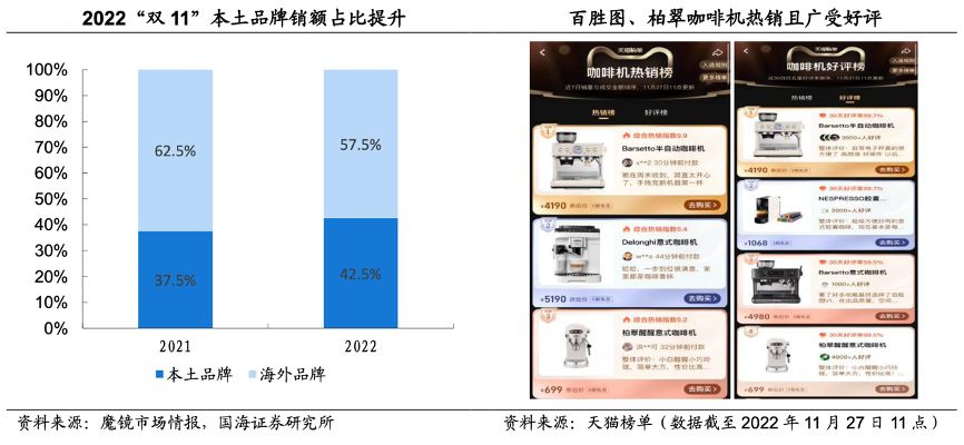 經(jīng)典案例:根據(jù)魔鏡市場情報、天貓榜單、國海證券研究所等綜合資訊表明,從我國咖啡機銷售表現(xiàn)來看,德龍、奈斯派索、飛利浦等中高端海外品牌占據(jù)市場主流,結(jié)合魔鏡市場數(shù)據(jù)(淘寶天貓數(shù)據(jù)),2022M6 德龍咖啡機銷額 10726 萬元(同 比+126%),“雙 11”銷額 9663 萬元。百勝圖、柏翠等高性價比的本土品牌增 長亮眼,百勝圖咖啡機 2022M6 銷額 2479 萬元(同比+605%),“雙 11”銷額 3584 萬元達到 top2。