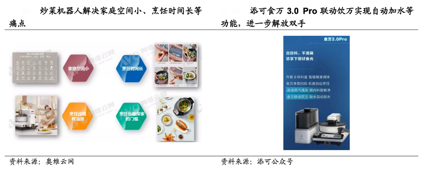 經(jīng)典案例:根據(jù)奧維云網(wǎng)、添可公眾號、國海證券研究所等綜合資訊表明,從產(chǎn)品創(chuàng)新來看,炒菜機器人解決了家庭空間小、烹飪時間長等痛點,添可食萬3.0 Pro 聯(lián)動飲萬實現(xiàn)自動加水等功能,進一步解放雙手。