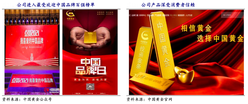 經典案例:根據中國黃金天貓、京東官方旗艦店、開源證券研究所等綜合資訊表明,作為黃金珠寶板塊唯一上市央企,中國黃金品牌具有較高知名度、認可度。2021 年,中國黃金被中國黃金報社授予“全國連鎖推薦品牌”稱號,榮登中國國家品牌網“點贊 2021 我喜愛的中國品牌”百強榜單,品牌價值位居零售業企業前 5 名。