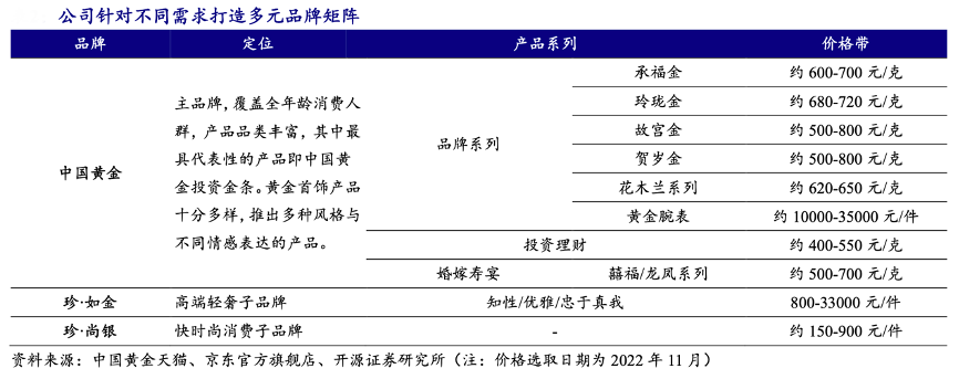 經典案例:根據中國黃金公眾號、中國黃金官網、開源證券研究所等綜合資訊表明,中國黃金公司以“中國黃金”為主品牌,主打投資金條、金飾產品,覆蓋老中青全年齡層消費人群。同時其精準定位年輕女性客群,2012 年推出主打高端輕奢產品的珍·如金品牌,2014 年推出定位快時尚產品的珍·尚銀品牌,旨在通過豐富品牌矩陣、進行差異化布局以滿足更廣泛客群的多樣化需求。