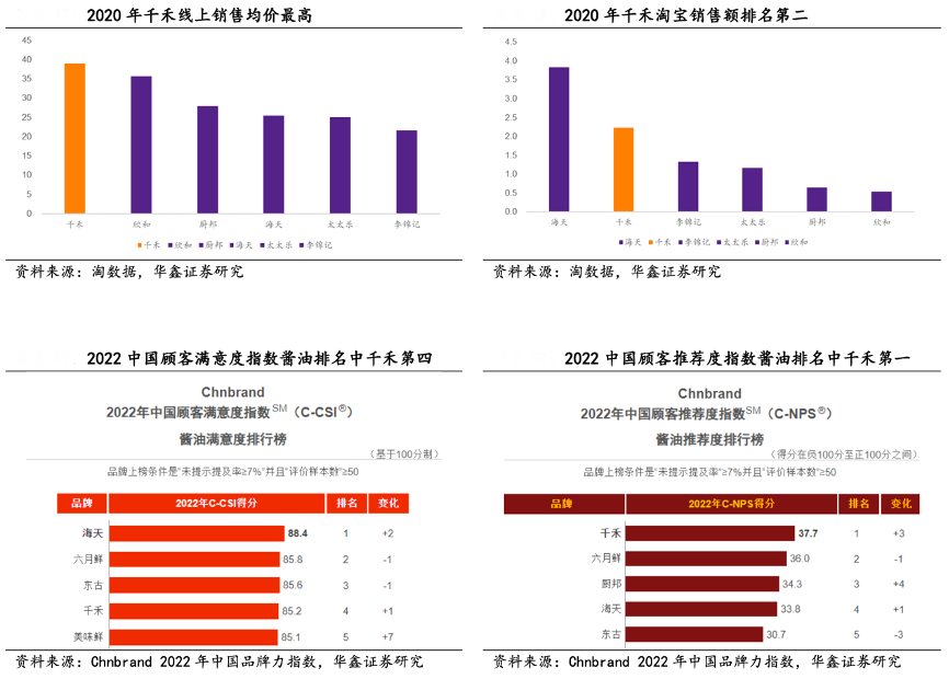 經(jīng)典案例:根據(jù)淘數(shù)據(jù)、Chnbrand 2022年中國(guó)品牌力指數(shù)、華鑫證券研究等綜合資訊表明,千禾公司零添加的產(chǎn)品形象深入人心,在消費(fèi)者中提到零添加基本上就會(huì)聯(lián)想至千禾。根據(jù) Chnbrand 2022 年中國(guó)品牌力指數(shù),千禾的品牌聯(lián)想指數(shù)排名第二,在醬油推薦度和滿意度榜單中分列 1、4 名,在食醋推薦度榜單中名列第三。根據(jù)淘數(shù)據(jù),2020 年 千禾在淘寶銷(xiāo)售中,均價(jià)最高,銷(xiāo)售額仍高居第二,占淘寶調(diào)味品總銷(xiāo)售額的 12%。千禾中高端的零添加品牌形象基本形成,品牌影響力持續(xù)增強(qiáng)。