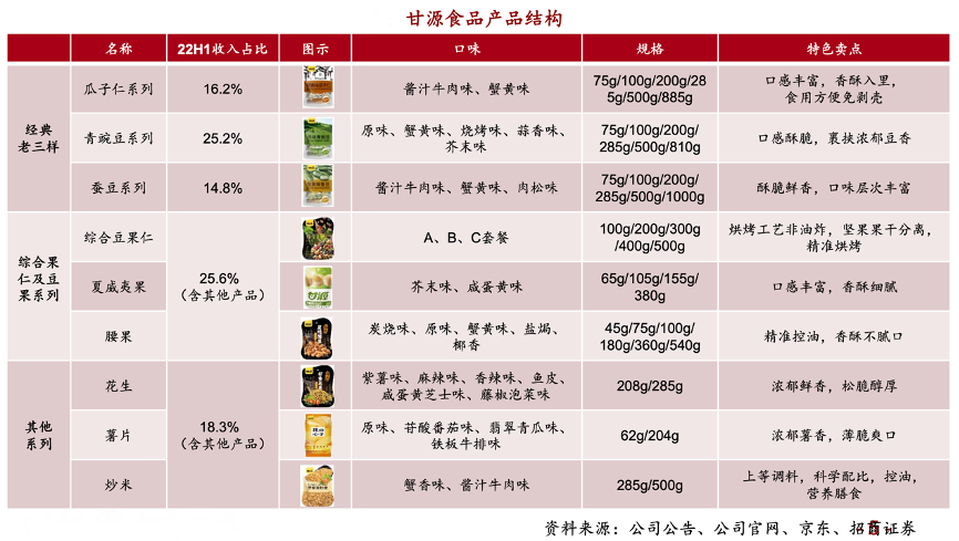 經典案例:根據公司公告、公司官網、京東和招商證券等綜合資訊表明,甘源食品公司產品主要包含老三樣(瓜子仁、青豌豆、蠶豆系列)、綜合果仁及豆果系列、其他(花生、玉米、麥片等),其中經典老三樣22H1占比約為56%,但增速相對放緩。21年公司開始加大新品開發推廣,夏威夷果仁、花生、豆果、米餅等新品市場反饋不錯,綜合果仁及豆果系列和其他系列占比持續提升,22H1分別占比 26%、18%。