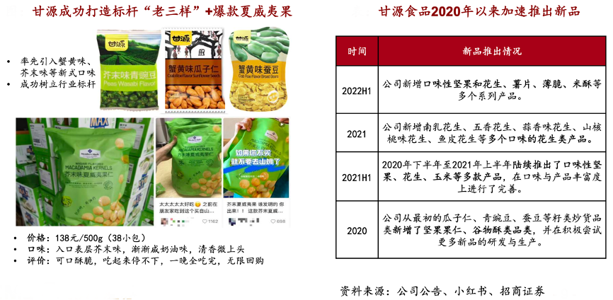 經典案例:根據公司公告、小紅書、招商證券等綜合資訊表明,甘源食品在成立之初就開始專注探索堅果深加工處理,在行業內率先使用獨立手抓包規格并開拓引入蟹黃味、芥末味等新式口味,已成功樹立老三樣標桿產品地位,先發優勢十分明顯。同時2020年以來公司持續延伸擴充 品類,陸續推出多種花生、口味性堅果、烘焙類及膨化類食品,加速新品布局上市。