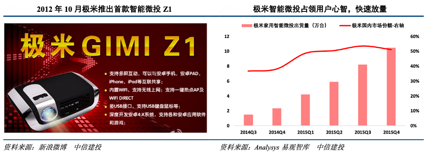 經(jīng)典案例:根據(jù)新浪微博、Analysys易觀智庫、中信建投等綜合資訊表明,極米通過顛覆式創(chuàng)新開創(chuàng)家用智能投影品類,初創(chuàng)團(tuán)隊(duì)將 LED 光源應(yīng)用 于投影儀,解決燈泡耗材問題;開發(fā) GMUI 系統(tǒng),解決內(nèi)容互聯(lián)問題;發(fā)明自動(dòng)對焦系統(tǒng),解決產(chǎn)品調(diào)試問題; 重新定義家用投影儀產(chǎn)品,智能投影走入千家萬戶。從 Z1 到 Z3,以及軟件系統(tǒng)都經(jīng)歷反復(fù)的調(diào)校和改進(jìn),2014 年 4 月才正式對外發(fā)布第一代量產(chǎn)產(chǎn)品極米 Z3。在資本助推下,極米正式進(jìn)入量產(chǎn)階段,同時(shí)補(bǔ)足內(nèi)容端和渠 道端缺口,極米智能微投銷量快速提升。