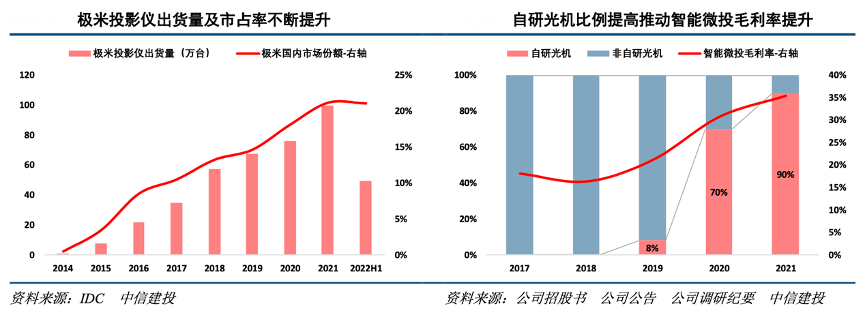 經(jīng)典案例:根據(jù)新IDC、公司招股書、公司公告、公司調(diào)研紀(jì)要、中信建投等綜合資訊表明,極米市場份額持續(xù)提高,但是硬件利潤微薄,根據(jù)極米董事長在億萬 創(chuàng)業(yè)營的分享,Z4X 毛利率僅有 5%。因此極米通過光學(xué)研究+擴(kuò)充產(chǎn)品線,解決國產(chǎn)替代和降本增效的問題。 1)2014 年成立光學(xué)實(shí)驗(yàn)室對基礎(chǔ)光學(xué)進(jìn)行研究,2019 年光機(jī)自研突破并逐步導(dǎo)入量產(chǎn),2021 年自研光機(jī)比例 達(dá) 90%,已實(shí)現(xiàn)中高端產(chǎn)品的全面導(dǎo)入;2)2015 年開始在 Z 系列的基礎(chǔ)上,推出便攜系列、H 系列、激光電 視、智能投影吸頂燈、RS 系列等產(chǎn)品。2018 年以來,極米國內(nèi)市場出貨量穩(wěn)居第一,市場占有率超過 20%, 呈現(xiàn)明顯的領(lǐng)先優(yōu)勢;同時(shí)毛利率整體提升。