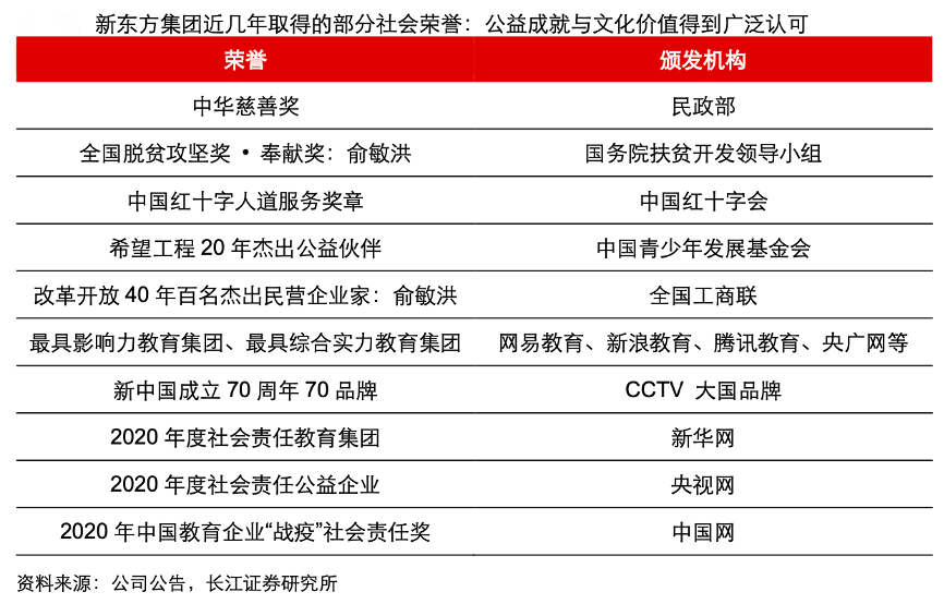 經典案例:根據公司公告、長江證券研究所等綜合資訊表明,自 1993 年北京新東方學校成立,其品牌已步入第30 年,始終致力于“努力成長為中國優 秀的、令人尊敬的、有文化價值的教育機構”;尤其在“雙減”考驗后,其在教育、公益方面的表現獲得了廣泛認可,獲得多項國家部委、社會組織、社會媒體的榮譽獎項。