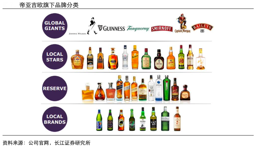 經(jīng)典案例:根據(jù)公司官網(wǎng)、長江證券研究所等綜合資訊表明,帝亞吉?dú)W的烈酒發(fā)展主要依賴威士忌、伏特加、朗姆和利口酒,公司旗下?lián)碛星?nbsp;30 個(gè) 世界頂級酒類品牌中的 8 個(gè),其中 4 個(gè)定位超高端,包括世界第一的伏特加品牌斯米 諾(Smirnoff)、世界第一的蘇格蘭威士忌品牌尊尼獲加(Johnnie Walker)、世界第一的利口酒品牌百利(Baileys)等,8 個(gè)頂級品牌中有 4 個(gè)定位超高端。