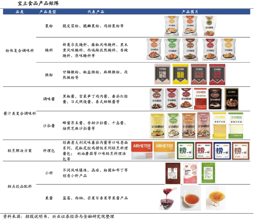 經典案例:根據招股說明書、興業證券經濟與金融研究院等綜合資訊表明,寶立食品公司早期客戶為百勝供應商,如泰森,正大食品等肯德基上游雞肉加工廠商均為客戶,以黃金雞塊裹粉發展至今。公司產品主要分為三大類,且不斷開拓創新,每年向客戶提供千余種單品。其中的輕烹解決方案主要包括意面、撈飯等系列料理醬包以及各口味料理湯包。