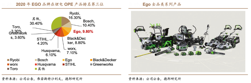經典案例:根據公司公告、弗若斯特沙利文、德邦研究所等綜合資訊表明,泉峰公司擁有較高的市場敏銳度,EGO 產品適用的 Arc-LithiumTM電池平臺為業 內首批 56V 電池平臺之一,以 POWER+電池平臺技術、智能電源管理和革命性 的冷卻技術,實現高功率和性能,EGO 產品也是業內首批可與傳統汽油發動機的 動力和性能相媲美的鋰電 OPE 產品之一。