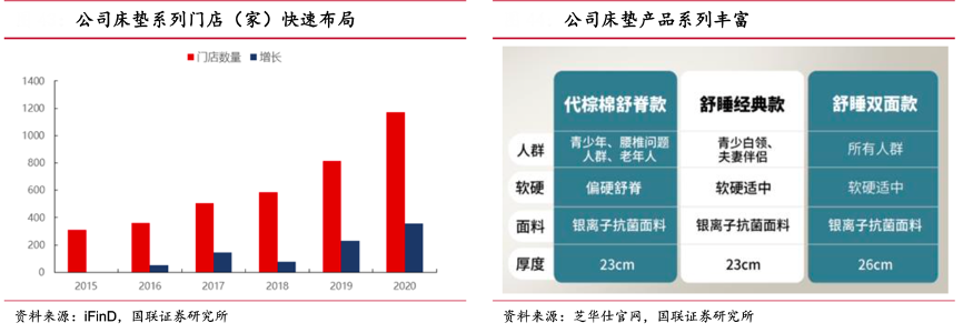 經(jīng)典案例:根據(jù)iFind、芝華仕官網(wǎng)、國聯(lián)證券研究所等綜合資訊表明,敏華控股公司自 2014 年開始在中國市場(chǎng)向消費(fèi)者提供“愛蒙”系列床墊產(chǎn)品,并于 2016 年以“芝華仕”品牌代替“愛蒙”在國內(nèi)開設(shè)專賣店,床類產(chǎn)品門店數(shù)量快速增長(zhǎng)。公司床墊性價(jià)比高,價(jià)格比慕思、喜臨門及顧家低,高性價(jià)比提高了公司沙發(fā)床墊連帶出售的吸引力。