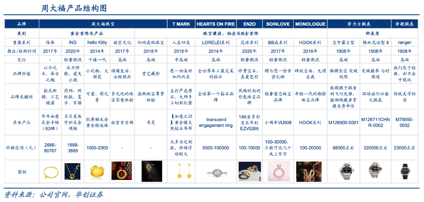 經典案例:根據公司官網、華創證券等綜合資訊表明,周大福在黃金首飾及產品FY2018-2022年復合增長率6.6%,珠寶鑲嵌類則因黃金首飾產品與鐘表類占比上升,占比有所下降,占比約21.7%,其中 T MARK 因獨特定制模式收入持續提升。