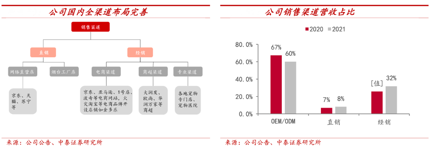 經典案例:根據公司公告、中泰證券研究所等綜合資訊表明,中寵股份公司目前在國內銷售渠道布局完善,占比均衡。線上渠道包括京東、天貓、抖音、拼多多等電商渠道。 線下渠道包括專業渠道(寵物醫院、寵物專門店等)和商超渠道等。2021年公司直營(直接面向消費者)收入占比為8.2%,經銷(電商、 商超、專業渠道)收入占比為31.7%。