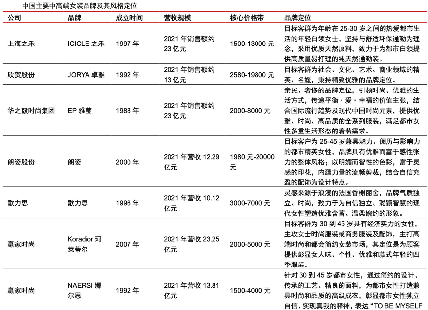 經典案例:根據各公司官網、公司公告、各品牌天貓官方旗艦店、中信證券研究部等綜合資訊表明,國內中高端女裝品牌大多目標客群為 25 到 40 歲都市女性,大致可以分為商務、時尚、潮流三類 品牌定位,核心價格帶集中于 2000 到 5000 元之間。其中規模超過 10 億元的中高端女裝 品牌數量較少,贏家時尚(珂萊蒂爾、娜爾思)、地素時尚(DAZZLE、d'zzit)旗下分別擁有 2 個超 10 億女裝品牌。
