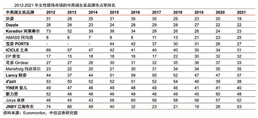 經典案例:根據Euromonitor、中信證券研究部等綜合資訊表明,結合Euromonitor 數據,過去 10 年我國女性服飾品牌中,多數中高端女裝品牌市占率呈現提升趨勢,其中玖姿、珂萊蒂爾、 之禾等國產品牌表現突出,2021 年市占率分別居 19、23、31 位,相比 2012 年分別提升 12、50、38 位。
