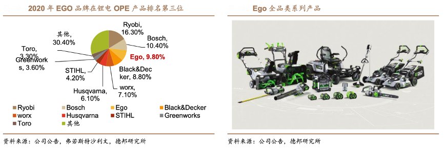 經(jīng)典案例:根據(jù)公司公告、弗若斯特沙利文、德邦研究所等綜合資訊表明,泉峰公司于 2013 年創(chuàng)立 EGO 品牌,率先布局高電壓電池平臺,產(chǎn)品地位領(lǐng)先。截至 21H1,EGO 品牌共推出 59 款產(chǎn)品,包括騎乘式割草機(jī)、手推式割草機(jī)、吹風(fēng)機(jī)、修枝機(jī)、鏈鋸等。根據(jù)弗若斯特沙利文數(shù)據(jù),2020 年公司 EGO 品牌在全球十大鋰電OPE 品牌中位列第三位,占據(jù) 9.8%的市場份額。