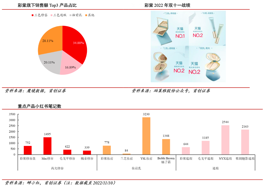 經(jīng)典案例:根據(jù)魔鏡數(shù)據(jù)、珀萊雅股份公眾號(hào)、蟬小紅、首創(chuàng)證券等綜合資訊表明,珀萊雅大單品銷售亮眼,根據(jù) 22 年 1-10 月線上銷售數(shù)據(jù),彩棠主打的三款大單品三色修容、三色遮瑕及妝前乳分別占據(jù)品牌總銷額的34.88%、16.89%、20.11%。小紅書的推薦中,三款產(chǎn)品毫不遜色,出現(xiàn)在各達(dá)人與修容產(chǎn)品相關(guān)的測(cè)評(píng)中。2022 年,在競(jìng)爭(zhēng)激烈的雙十一戰(zhàn)場(chǎng)上,彩棠的產(chǎn)品分別占據(jù)天貓高光類目的前兩名以及遮瑕妝前類目的第二名的位置。