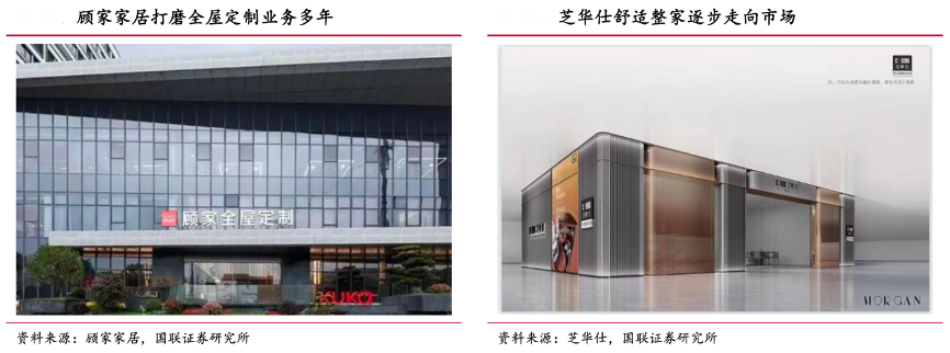 經典案例:根據顧家家居、芝華仕、國聯證券研究所等綜合資訊表明,軟體家居龍頭顧家家居和芝華仕拓展全屋定制邁向大家居。顧家家居于 2015 年推出全屋定制產品,打磨多年后商業模式逐漸 成型,渠道門店近年來穩步落地。敏華控股于 2021 年并購那庫拓展定制業務,依托原有銷售渠道優勢,為消費者提供一體化家居服務,定制業務于 2022 年走向市場。