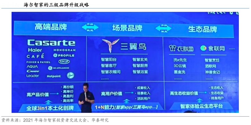 經典案例:根據2021年海爾智家投資者交流大會、華泰研究等綜合資訊表明,海爾從 1985 年“砸冰箱”到 2000 年提出自主品牌出海、2005-2012 年不斷收購海外家電資產,再到 2016-2019 探索“創客小微”管理模式,“海爾智家”致力于推進“三級品牌升級戰略”。