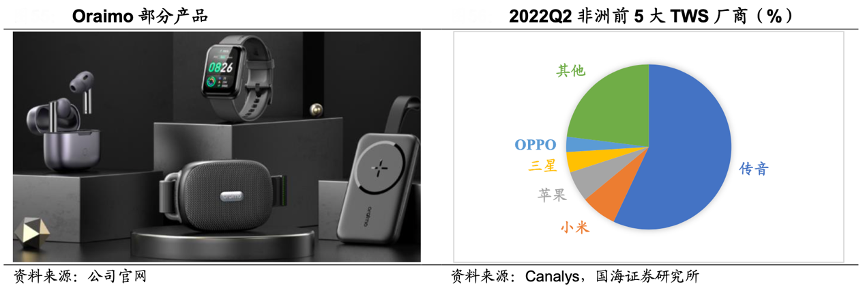 經典案例:根據公司官網、Canalys、國海證券研究所等綜合資訊表明,傳音公司 3C 匹配件品牌 oraimo,定位為新興市場高端知名音頻品牌。產品類型涵 蓋 TWS 和 Open audio、音箱和有線耳機四個大品類,其中 TWS 方向為品牌主 攻。品牌專注于為全球年輕消費者打造酷炫的、獨具創(chuàng)意的智能配件產品,現(xiàn)已成為非洲最受消費者歡迎的 3C 配件品牌之一,截至 2022 年 9 月,已成功覆蓋 非洲、南亞,東南亞,拉美等 50 多個國家和地區(qū),用戶規(guī)模超 1 億。