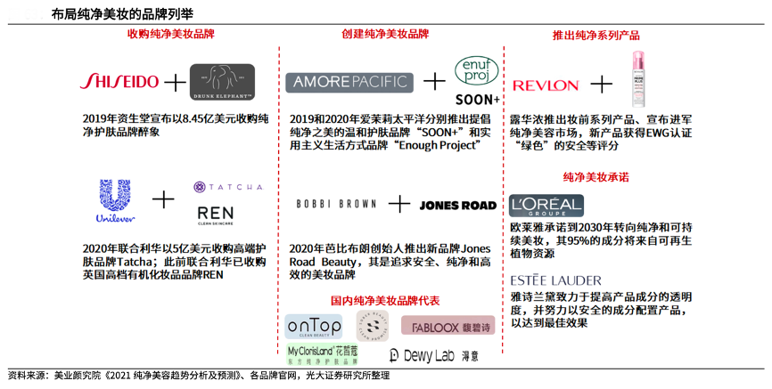 經(jīng)典案例:根據(jù)美業(yè)顏究院《2021純凈美容趨勢分析及預測》、各品牌官網(wǎng)、光大證券研究所等綜合資訊表明,隨著純凈美妝概念興起,品牌商紛紛入局純凈美妝賽道,國外化妝品品牌亦通過收購或自建品牌入局純凈美妝賽道,例如,資生堂 2019 年以 8.45 億美元收購新銳純凈護膚品牌醉象,聯(lián)合利華 2020 年以 5 億美元收購天然的高端護膚品牌 Tatcha,且早在五年前聯(lián)合利華已收購高檔有機化妝品品牌 REN。