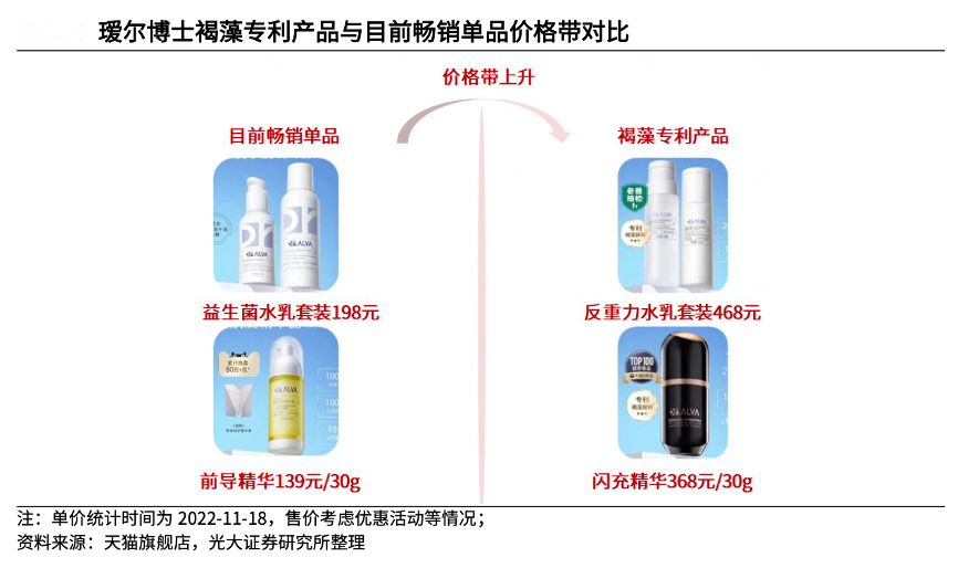經(jīng)典案例:根據(jù)天貓旗艦店、光大證券研究所等綜合資訊表明,以璦爾博士為例,早期品牌推出益生菌水乳、益生菌面膜等產(chǎn)品將微生態(tài)護膚概念推廣出來。2021 年其推出抗初老方向的國家專利成分“益生菌發(fā)酵褐藻”,創(chuàng)新性地采取雙菌二次發(fā)酵技術,目前旗下產(chǎn)品反重力水乳套裝以及閃充精華均搭載褐藻專利技術,定價分別為468元、368元,相較此前推出的益生菌水乳套裝(198 元)以及前導精華(139 元) 價格帶實現(xiàn)上移。