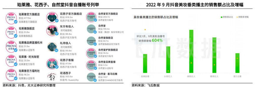 經(jīng)典案例:根據(jù)抖音、飛瓜數(shù)據(jù)、光大證券研究所等綜合資訊表明,以珀萊雅為例,截至 2022 年 6 月末,珀萊雅抖音自播和達播的銷售占比為 6:4。目 前珀萊雅在抖音設有 7 個賬號,其中“珀萊雅官方旗艦店”粉絲數(shù)量最多、達 478 萬,其余賬號粉絲量均在 100 萬以下。