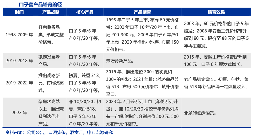 經(jīng)典案例:根據(jù)公司公告、云酒頭條、酒食匯、申萬(wàn)宏源研究等綜合資訊說(shuō)明,從產(chǎn)品培育路徑來(lái)看,口子窖公司前期培育出以年份系列為主的完整價(jià)格帶產(chǎn)品,2019 年后陸續(xù)推出新品迭代升級(jí),聚焦次高端及以上。2023 年,公司產(chǎn)品戰(zhàn)略繼續(xù)向上升級(jí),聚焦次高端及以上推出兼系列產(chǎn)品,對(duì)年份系列產(chǎn)品升級(jí)迭代。
